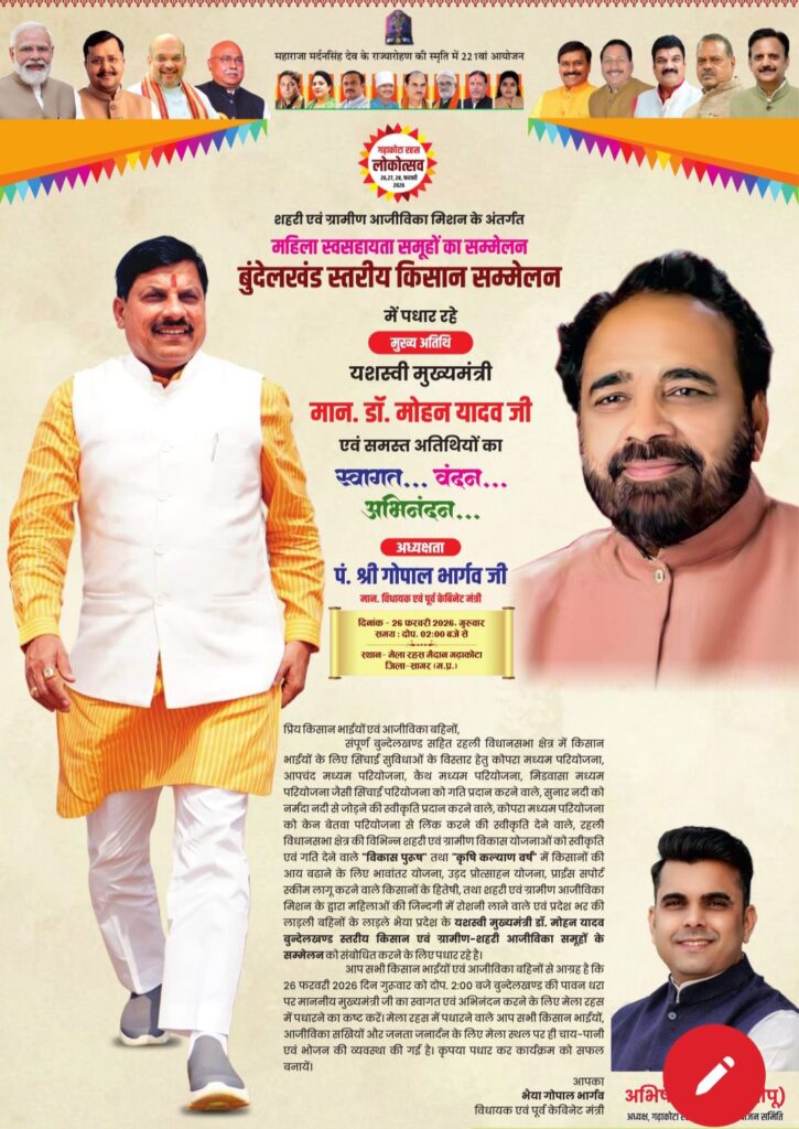 सागर गढ़ाकोटा रहस लोकोत्सव 2026 के अंतर्गत 26 फरवरी 2026, गुरुवार को सायं 4 बजे रहस मेला मैदान, गढ़ाकोटा में बुंदेलखंड स्तरीय किसान एवं ग्रामीण-शहरी आजीविका समूहों का सम्मेलन आयोजित किया जाएगा। इस सम्मेलन में प्रदेश के मुख्यमंत्री डॉ. मोहन यादव मुख्य अतिथि के रूप में शामिल होकर किसानों और आजीविका समूहों को संबोधित करेंगे।