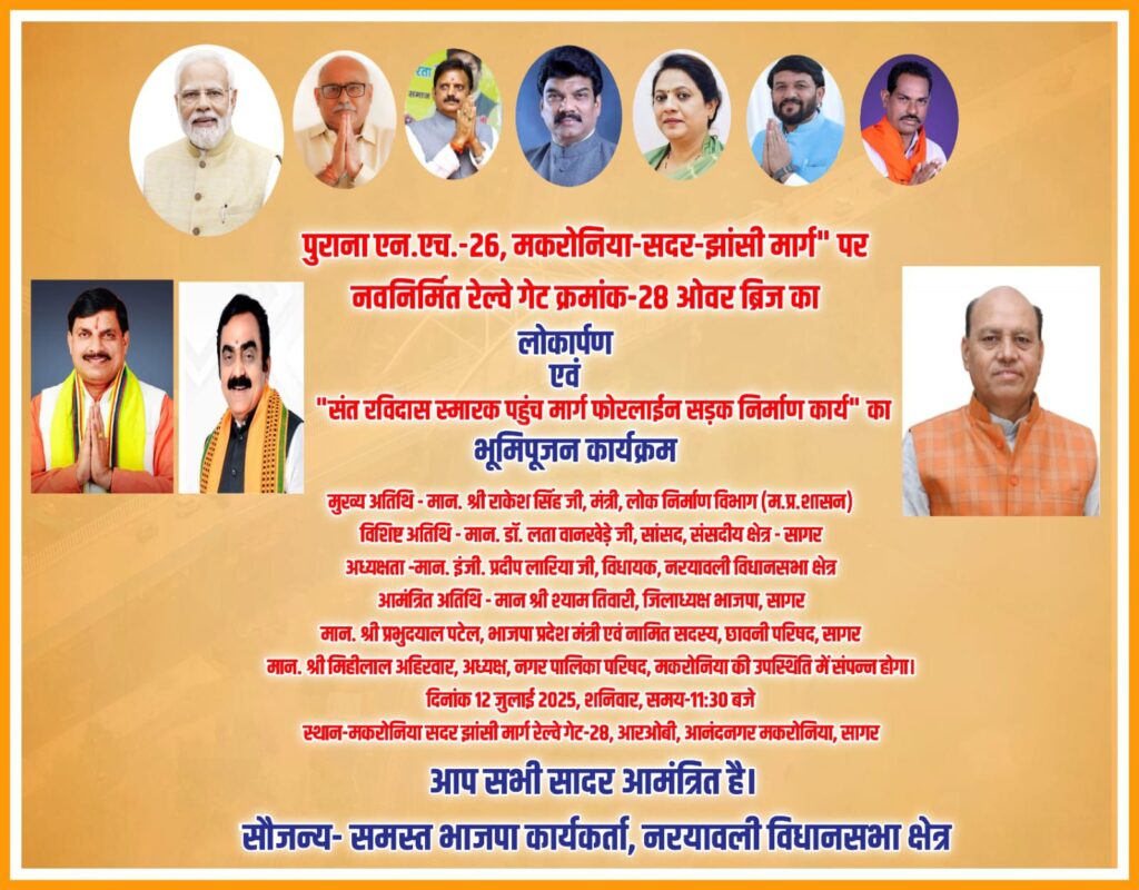 सागर मध्यप्रदेश के लोक कल्याण के लिए ,सागर लोक निर्माण मंत्री श्री राकेश सिंह सागर में उपनगर मकरोनिया से सदर को जोड़ने वाला रेलवे गेट नं. 28 पर बने रेलवे ओवर ब्रिज के लोकार्पण अवसर पर व्यक्त किए। 4309.24 लाख रुपए (रेल्वे भाग सहित) की लागत राशि से बनने वाले इस ब्रिज की कुल लंबाई लंबाई 884.78 मीटर है।